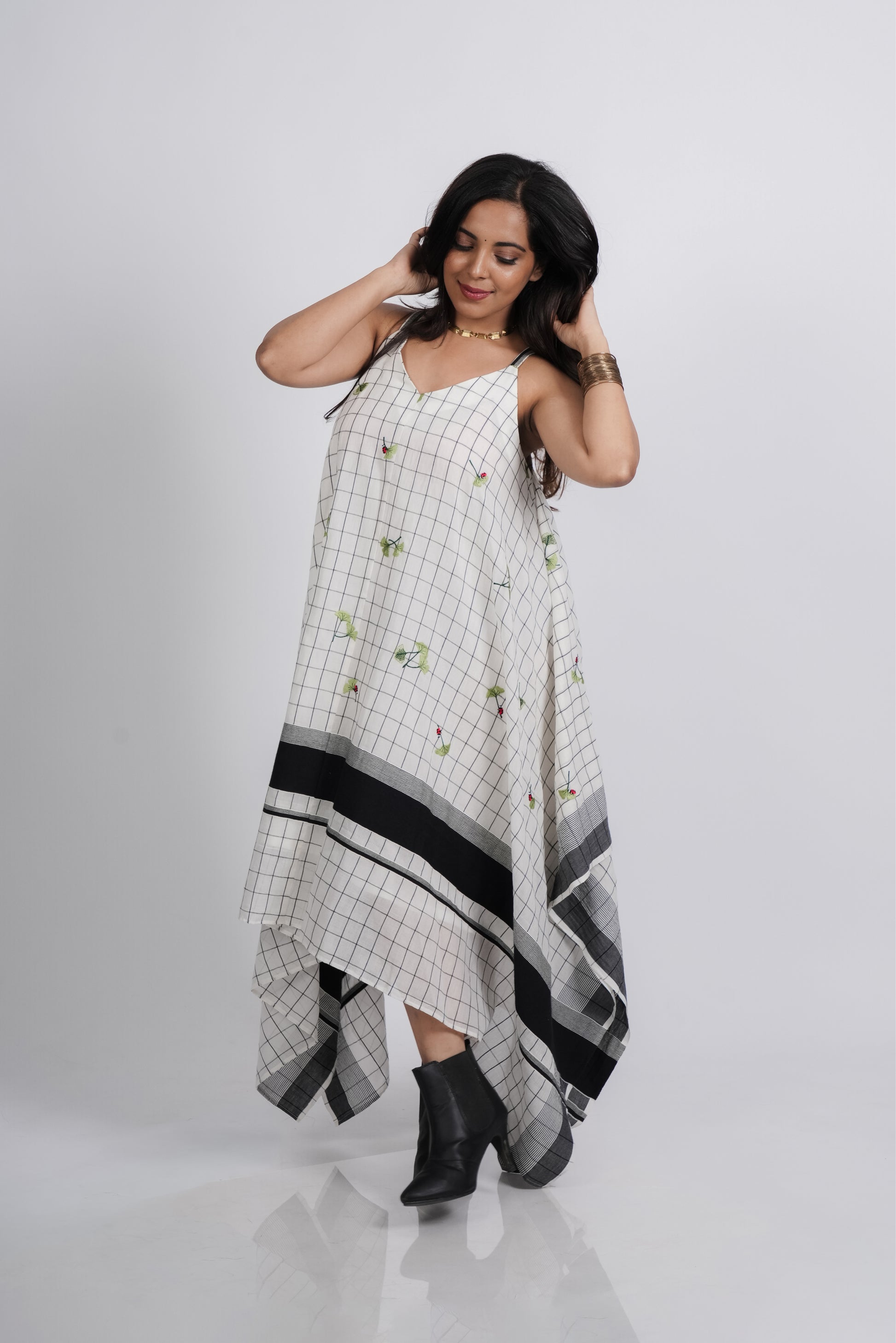 This handwoven cotton dress features a classic black and white checkered pattern with a delicate handkerchief hem, adding a subtle touch of elegance. The refined V-neckline enhances its sophisticated silhouette, making it a timeless piece for any wardrobe. Comfortable and stylish, it effortlessly blends traditional craftsmanship with modern design.